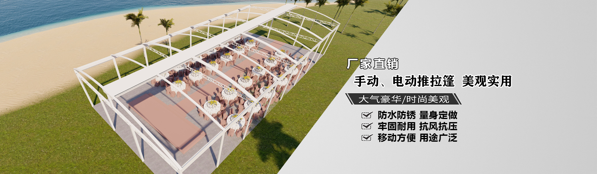 青島金福瑞戶外用品有限公司是一家專業(yè)從事生產(chǎn)、研發(fā)、銷售為一體的主營推拉篷、電動推拉篷、大型雨棚、戶外倉儲雨棚、智能防風(fēng)卷簾、智能涼亭、快速門、戶外遮陽擋雨產(chǎn)品的公司,我司創(chuàng)立于2011年,位于美麗的海邊城市——青島。本公司專業(yè)制作:推拉篷、電動推拉篷、大型雨棚、戶外倉儲雨棚、電動折疊篷、智能防風(fēng)卷簾、鋁合金翻版涼亭、pvc快速門、堆積門、膜結(jié)構(gòu)篷、車棚、曲臂篷、固定篷、崗臺傘、庭院傘等戶外遮陽、擋雨產(chǎn)品以及各種崗臺、崗?fù)ぁN覀冏⒅禺a(chǎn)品的質(zhì)量與服務(wù),為廣大客戶的需求提供完善的解決方案。可根據(jù)您的需求為您量身定做,以經(jīng)濟(jì)實(shí)用、自然、唯美、時尚為追求,全心全意為熱愛生活、熱海事業(yè)的您尋找不一樣的感觸與享受。...